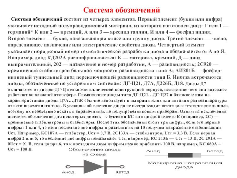 цифра) указывает исходный полупроводниковый материал, из которого изготовлен диод: Г или 1 — германий* К или 2 — кремний, А или 3 — арсенид галлия, И или 4 — фосфид индия. Второй элемент — буква, показывающая класс или группу диода. Третий элемент — число, определяющее назначение или электрические свойства диода. Четвертый элемент указывает порядковый номер технологической разработки диода и обозначается от А до Я. Например, диод КД202А расшифровывается: К — материал, кремний, Д — диод выпрямительный, 202 — назначение и номер разработки, А — разновидность; 2С920 — кремниевый стабилитрон большой мощности разновидности типа А; АИЗ01Б — фосфид-индиевый туннельный диод переключающей разновидности типа Б. Иногда встречаются диоды, обозначенные по устаревшим системам: ДГ-Ц21, Д7А, Д226Б, Д18. Диоды Д7 отличаются от диодов ДГ-Ц цельнометаллической конструкцией корпуса, вследствие чего они надежнее работают во влажной атмосфере. Германиевые диоды типа ДГ-Ц21…ДГ-Ц27 и близкие к ним по характеристикам диоды Д7А…Д7Ж обычно используют в выпрямителях для питания радиоаппаратуры от сети переменного тока. В условное обозначение диода не всегда входят некоторые технические данные, поэтому их необходимо искать в справочниках по полупроводниковым приборам. Одним из исключений является обозначение для некоторых диодов с буквами КС или цифрой вместо К (например, 2С) — кремниевые стабилитроны и стабисторы. После этих обозначений стоит три цифры, если это первые цифры: 1 или 4, то взяв последние две цифры и разделив их на 10 получим напряжение стабилизации Uст. Например, КС107А — стабистор, Uст = 0,7 В, 2С133А — стабилитрон, Uст = 3,3 В. Если первая цифра 2 или 5, то последние две цифры показывают Uст, например, КС 213Б — Uст = 13 В, 2С 291А — 0Uст = 91 В, если цифра 6, то к последним двум цифрам нужно прибавить 100 В, например, КС 680А – Uст = 180 В.