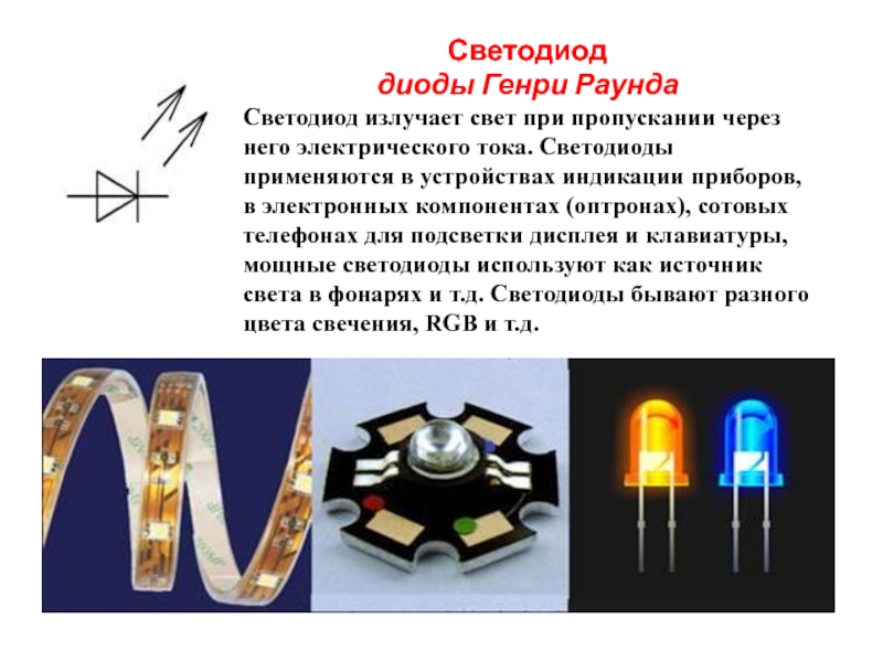 Светодиоды применяются в устройствах индикации приборов, в электронных компонентах (оптронах), сотовых телефонах для подсветки дисплея и клавиатуры, мощные светодиоды используют как источник света в фонарях и т.д. Светодиоды бывают разного цвета свечения, RGB и т.д.