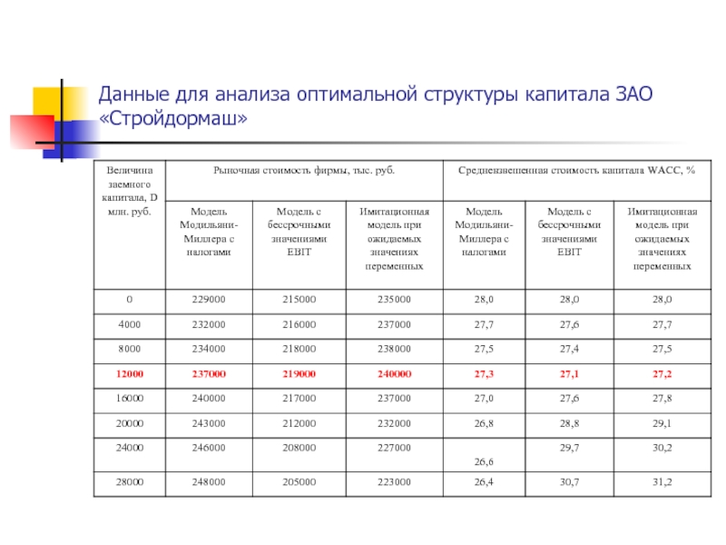 Слайд 7Данные для анализа оптимальной структуры капитала ЗАО «Стройдормаш»