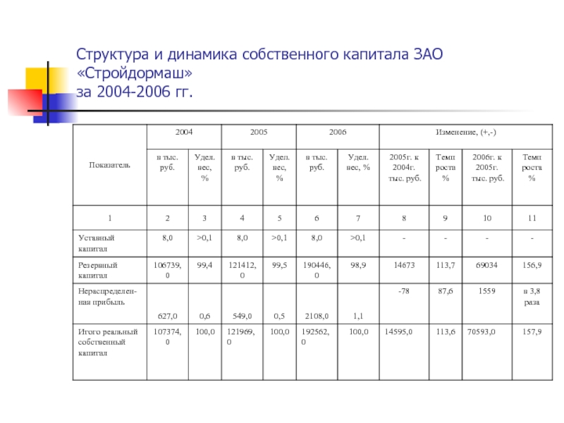 Слайд 3Структура и динамика собственного капитала ЗАО «Стройдормаш» за 2004-2006 гг.