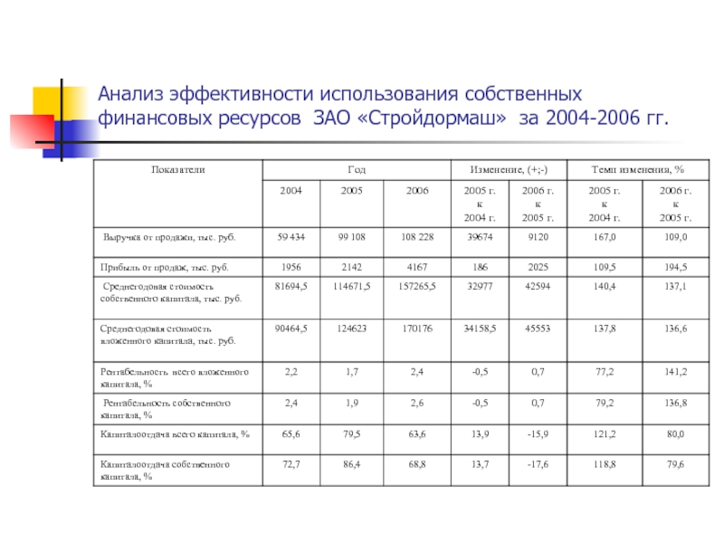 Слайд 4Анализ эффективности использования собственных финансовых ресурсов ЗАО «Стройдормаш» за 2004-2006 гг.