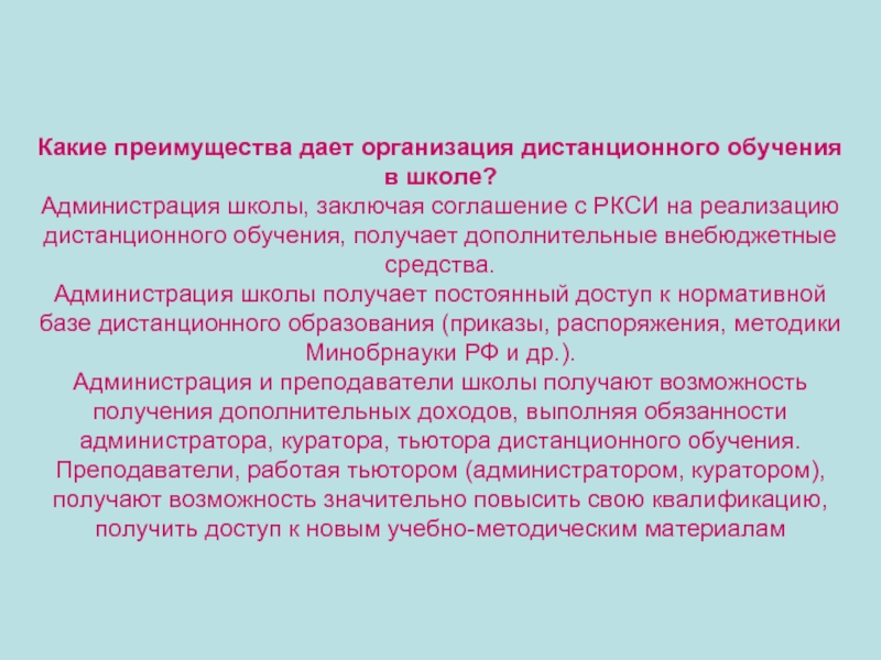 Администрация и преподаватели школы получают возможность получения дополнительных доходов, выполняя обязанности администратора, куратора, тьютора дистанционного обучения.
