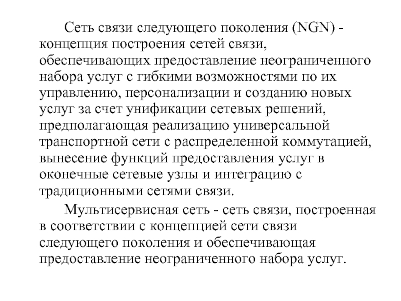 телекоммуникаций следующего поколения NGN может быть определена как широкополосная сеть пакетной коммутации обеспечивающая предоставление неограниченного набора услуг телекоммуникаций гарантированного качества, предполагающая разделение функций связанных с оказанием услуг от технологий переноса и коммутации и поддерживающая глобальную мобильность пользователя, то есть обеспечивающая возможностью доступа пользователя к телекоммуникационным услугам в независимости от местонахождения и используемой технологии.