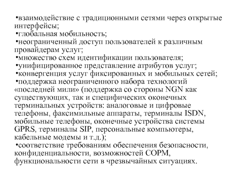 поддержка неограниченного набора технологий «последней мили» (поддержка со стороны NGN как существующих, так и специфических оконечных терминальных устройств: аналоговые и цифровые телефоны, факсимильные аппараты, терминалы ISDN, мобильные телефоны, оконечные устройства системы GPRS, терминалы SIP, персональные компьютеры, кабельные модемы и т.д.);