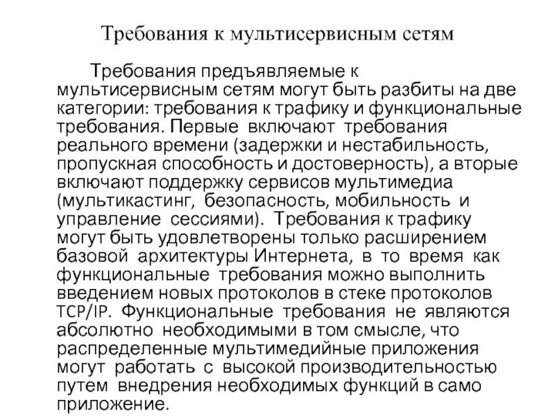 требования к трафику и функциональные требования. Первые включают требования реального времени (задержки и нестабильность, пропускная способность и достоверность), а вторые включают поддержку сервисов мультимедиа (мультикастинг, безопасность, мобильность и управление сессиями). Требования к трафику могут быть удовлетворены только расширением базовой архитектуры Интернета, в то время как функциональные требования можно выполнить введением новых протоколов в стеке протоколов TCP/IP. Функциональные требования не являются абсолютно необходимыми в том смысле, что распределенные мультимедийные приложения могут работать с высокой производительностью путем внедрения необходимых функций в само приложение.