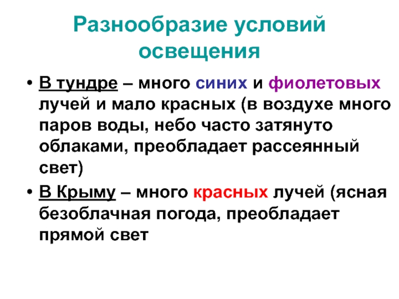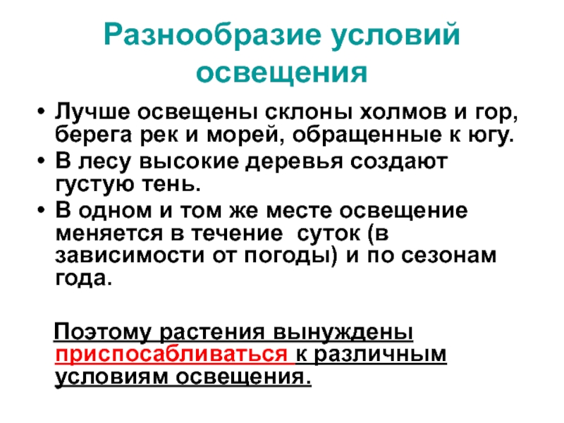 Разнообразие условий освещения