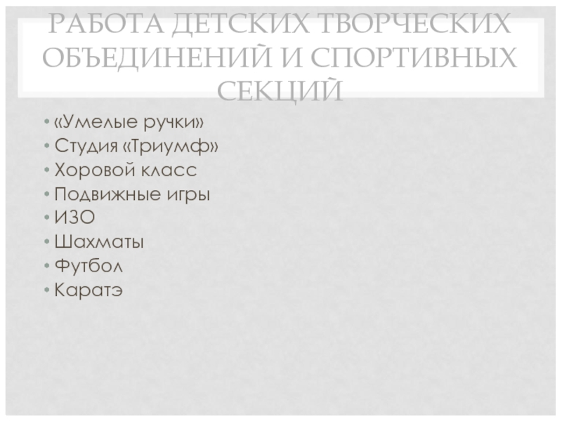 Слайд 7РАБОТА ДЕТСКИХ ТВОРЧЕСКИХ ОБЪЕДИНЕНИЙ И СПОРТИВНЫХ СЕКЦИЙ