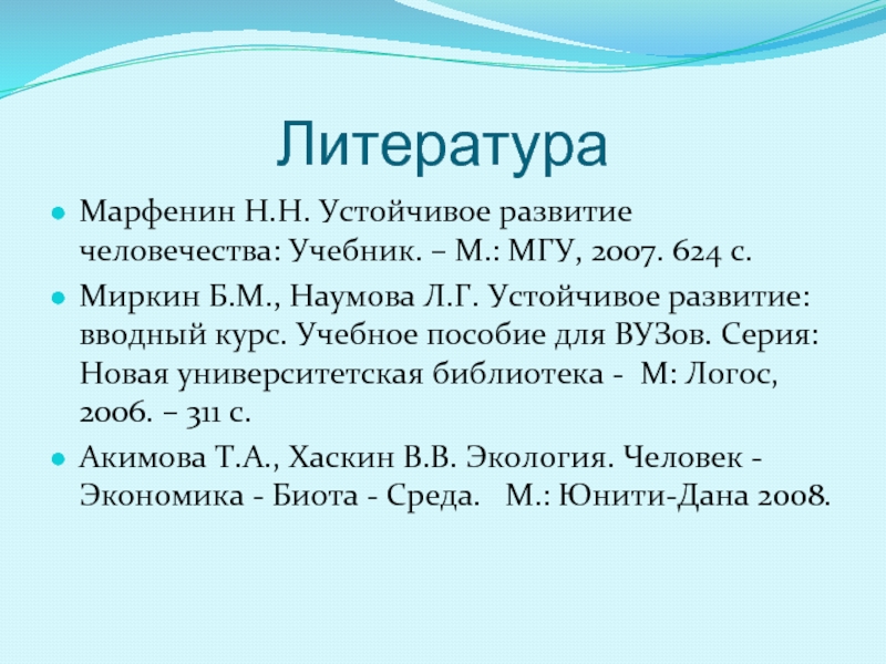 Марфенин Н.Н. Устойчивое развитие человечества: Учебник. – М.: МГУ, 2007. 624