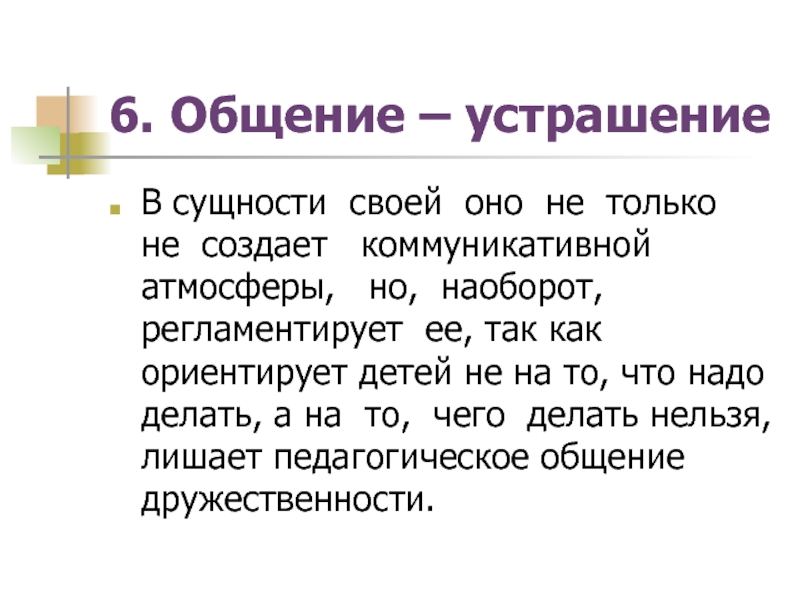 создает коммуникативной атмосферы, но, наоборот, регламентирует ее, так как ориентирует детей не на то, что надо делать, а на то, чего делать нельзя, лишает педагогическое общение дружественности.