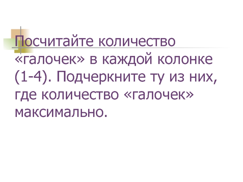 Слайд 25Посчитайте количество «галочек» в каждой колонке (1-4). Подчеркните ту из них,
