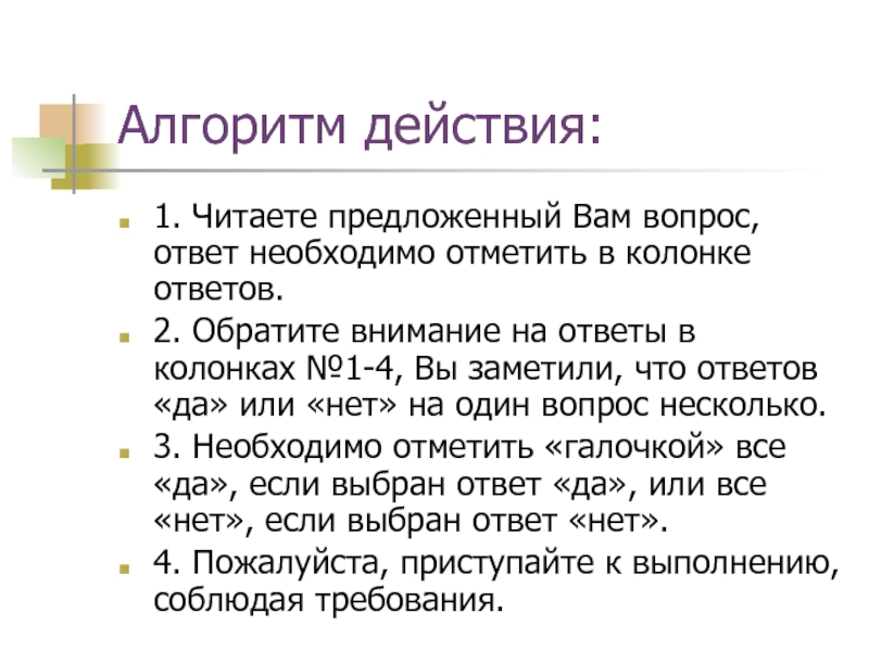 3. Необходимо отметить «галочкой» все «да», если выбран ответ «да», или все «нет», если выбран ответ «нет».