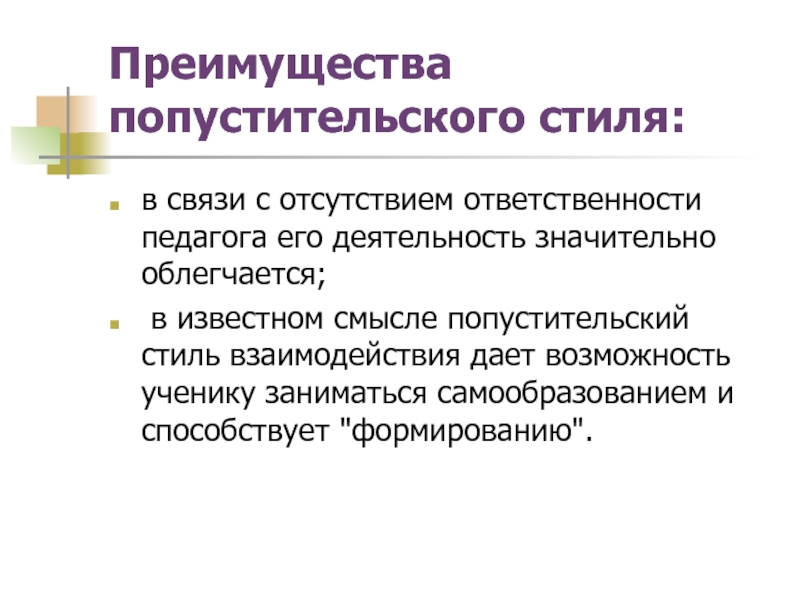 Слайд 14Преимущества попустительского стиля:
