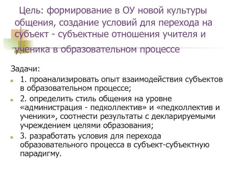Слайд 3 Цель: формирование в ОУ новой культуры общения, создание условий для