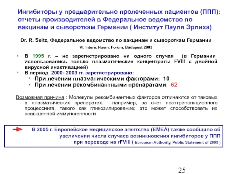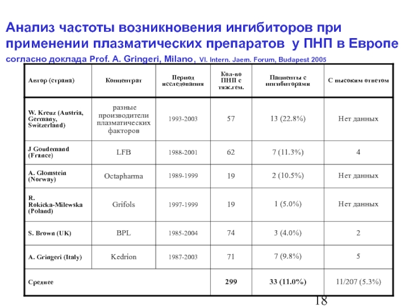 Анализ частоты возникновения ингибиторов при применении плазматических препаратов у ПНП в Европе