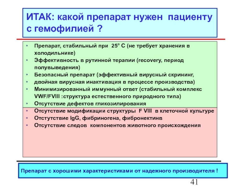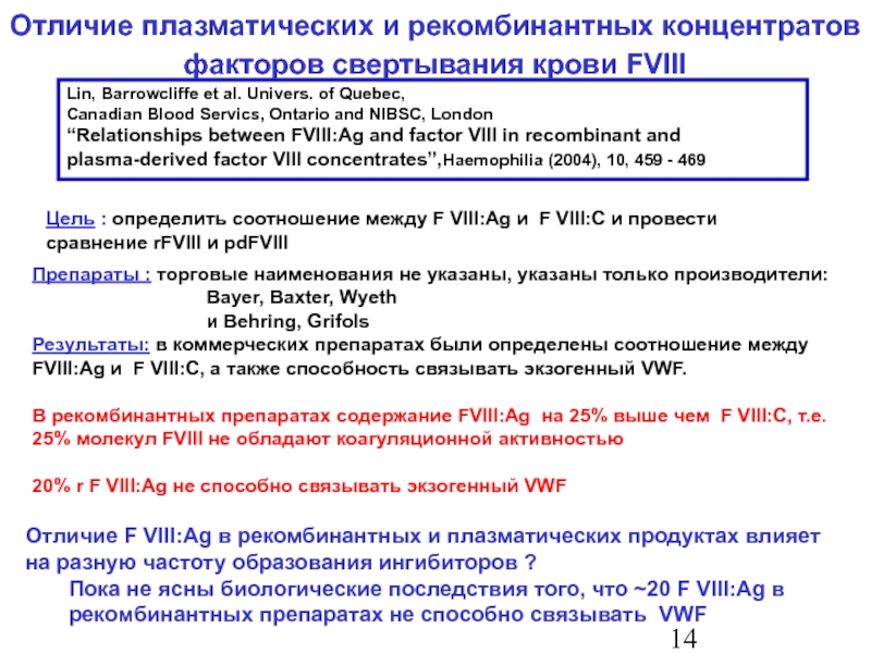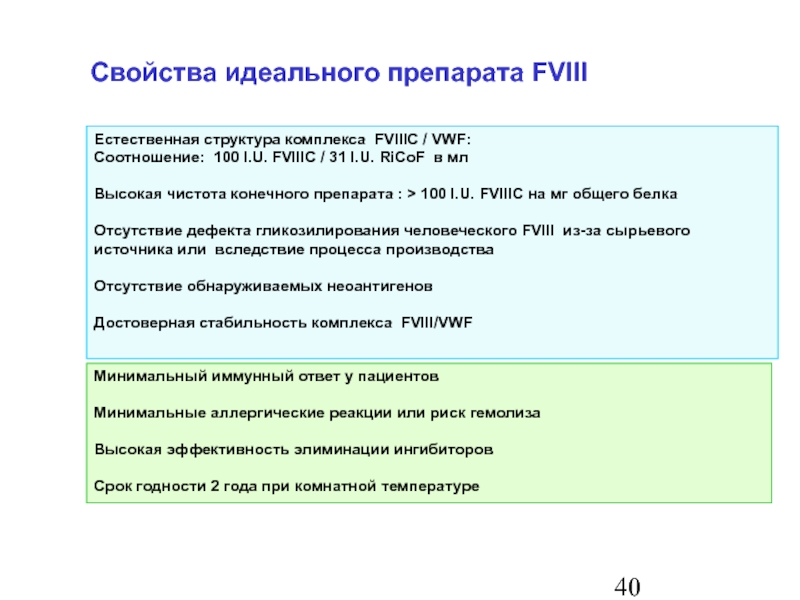 В рекомбинантных препаратах содержание FVIII:Ag на 25% выше чем F VIII:C, т.е. 25% молекул FVIII не обладают коагуляционной активностью