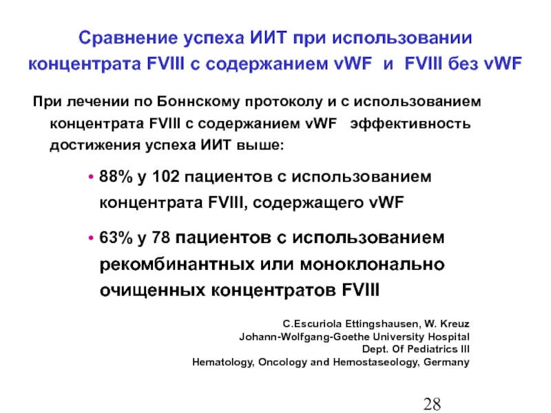 88% у 102 пациентов с использованием концентрата FVIII, содержащего vWF