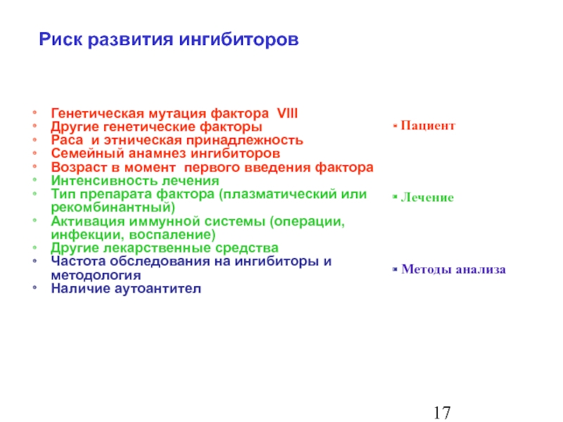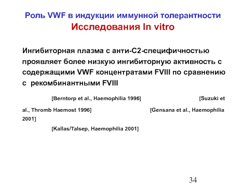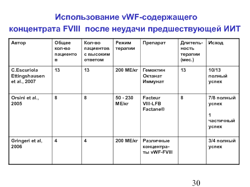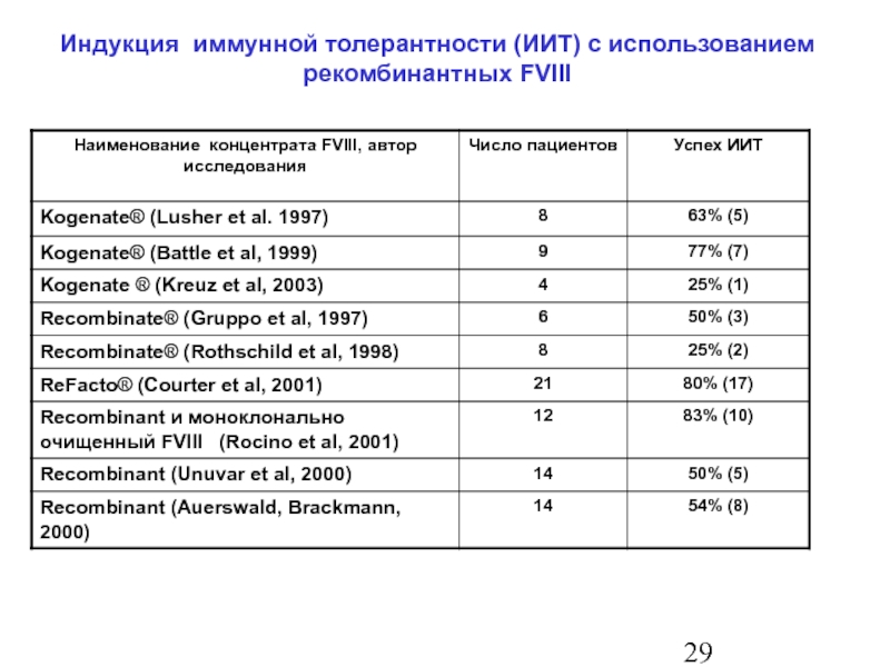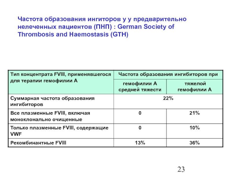 CANAL Study (клинически релевантные ингибиторы): 53/181 (29%)при лечении r FVIII, 5/33 (15%) при лечении pd F VIII low vWF и 24/102 (24%) (pd F VIII vWF> 0.001IU vWF/IU FVIII:Ag) [Gouw et al, Blood 2007]