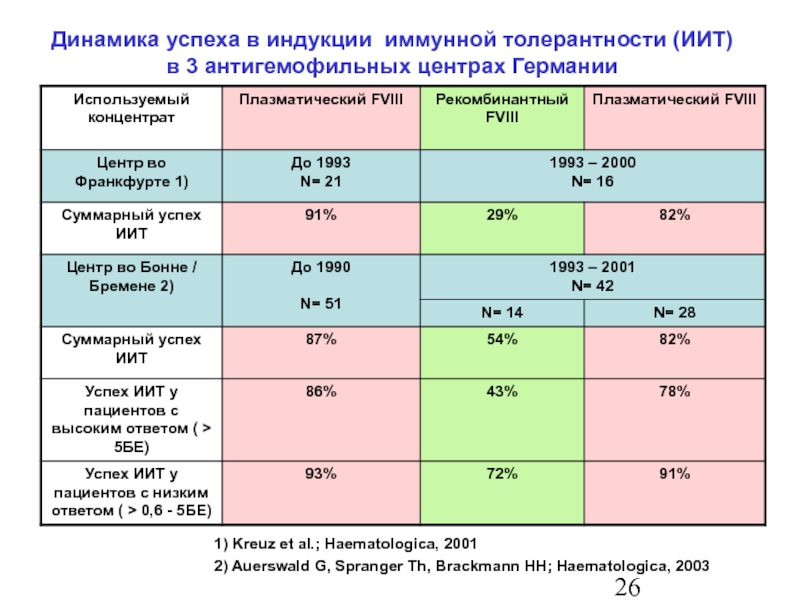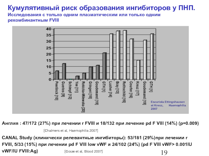 Англия : 47/172 (27%) при лечении r FVIII и 18/132 при лечение pd F VIII (14%) (p=0.009) [Chalmers et al, Haemophilia 2007]