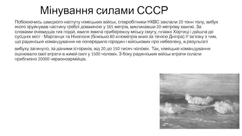 тонн толу, вибух якого зруйнував частину греблі довжиною у 165 метрів, викликавши 20-метрову хвилю. За словами очевидців тих подій, хвиля змила прибережну міську смугу, плавні Хортиці і дійшла до сусідніх міст - Марганця та Нікополя (близько 80 кілометрів вниз за течією Дніпра).У зв'язку з тим, що радянське командування не попередило городян і військових про небезпеку, в результаті вибуху загинуло, за даними істориків, від 20 до 150 тисяч чоловік. Так, німецьке командування оцінювало свої втрати в живій силі у 1500 чоловік. З боку радянських військ втрати склали приблизно 20000 червоноармійців.