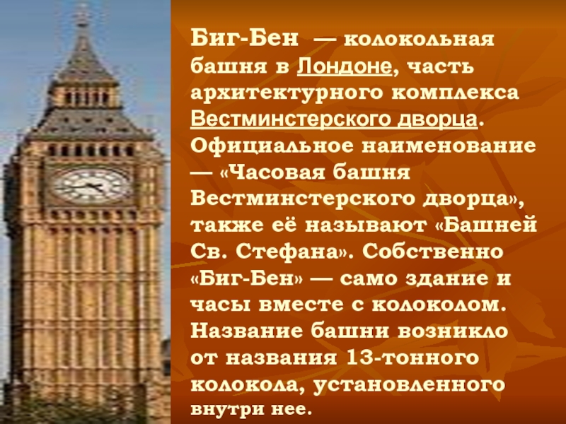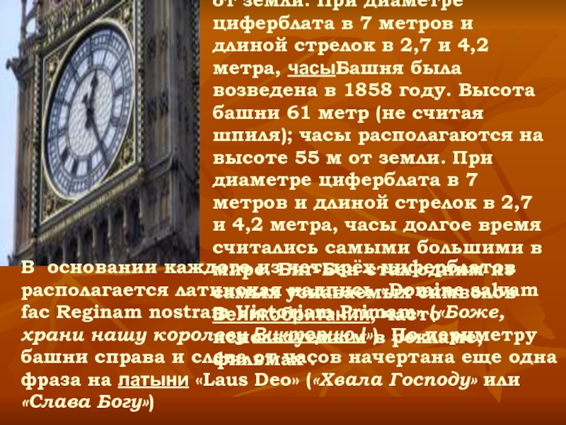 В основании каждого из четырёх циферблатов располагается латинская надпись «Domine salvam fac Reginam nostram Victoriam Primam» («Боже, храни нашу королеву Викторию I»). По периметру башни справа и слева от часов начертана еще одна фраза на латыни «Laus Deo» («Хвала Господу» или «Слава Богу»)