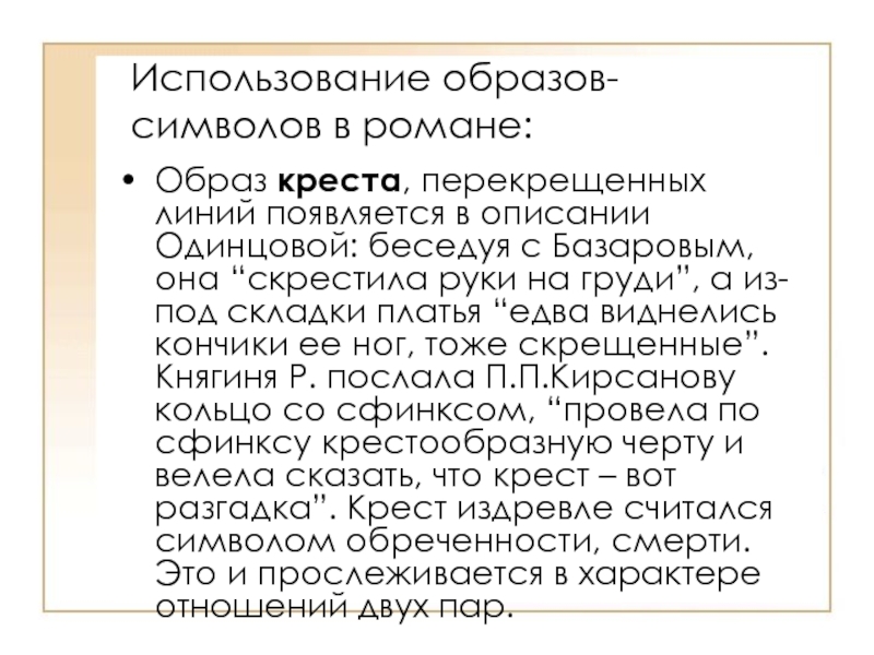беседуя с Базаровым, она “скрестила руки на груди”, а из-под складки платья “едва виднелись кончики ее ног, тоже скрещенные”. Княгиня Р. послала П.П.Кирсанову кольцо со сфинксом, “провела по сфинксу крестообразную черту и велела сказать, что крест – вот разгадка”. Крест издревле считался символом обреченности, смерти. Это и прослеживается в характере отношений двух пар.