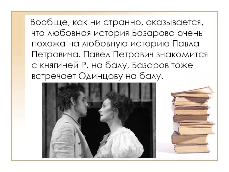 очень похожа на любовную историю Павла Петровича. Павел Петрович знакомится с княгиней Р. на балу, Базаров тоже встречает Одинцову на балу.