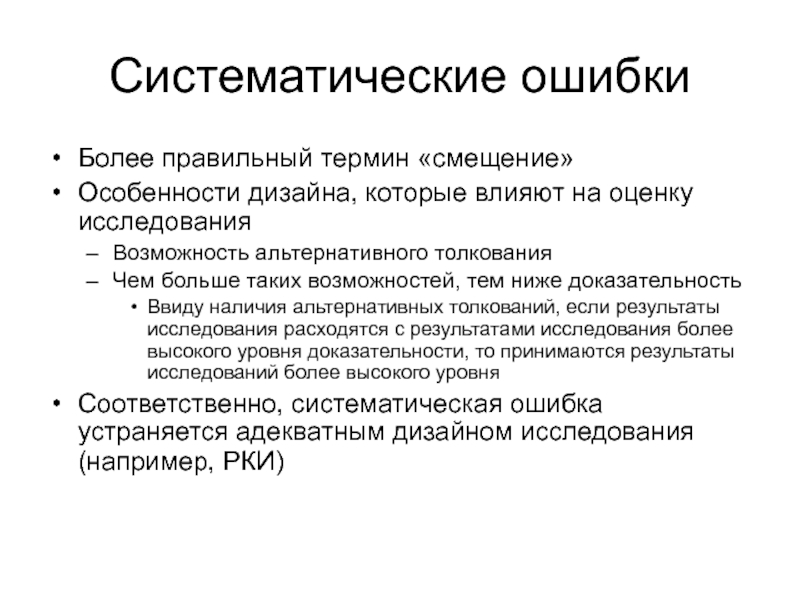 Соответственно, систематическая ошибка устраняется адекватным дизайном исследования (например, РКИ)