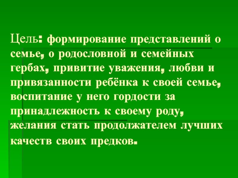 Слайд 6Цель: формирование представлений о семье, о родословной и семейных гербах, привитие