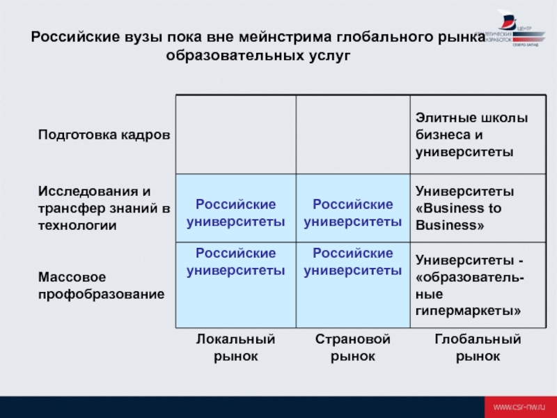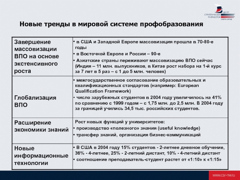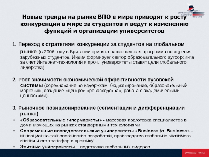 1. Переход к стратегиям конкуренции за студентов на глобальном рынке (в 2006 году в Британии принята национальная программа поощрения зарубежных студентов, Индия формирует сектор образовательного аутсорсинга за счет Интернет-технологий и проч.; университеты ставят цели глобального лидерства).