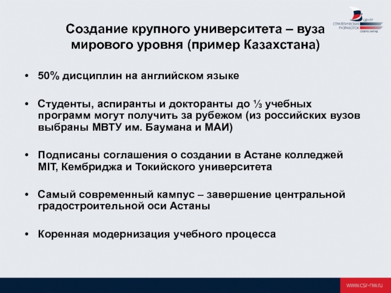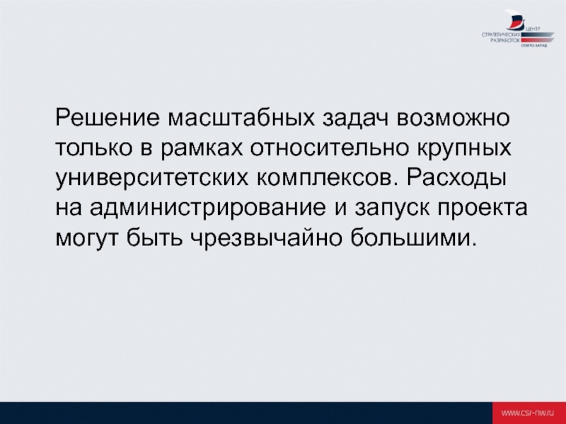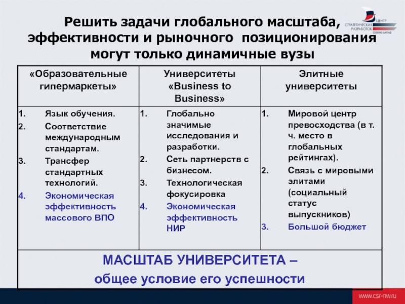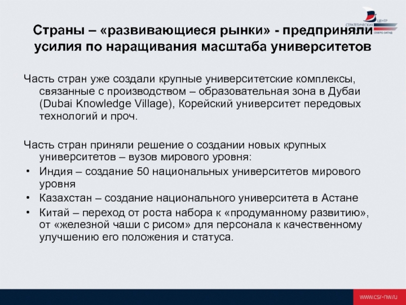 2. Для университетов стран – «развивающихся рынков» - ключевой проблемой становится достижение эффекта масштаба, концентрации на прорывных направлениях трансфера знаний в технологии, достижение мирового лидерства.