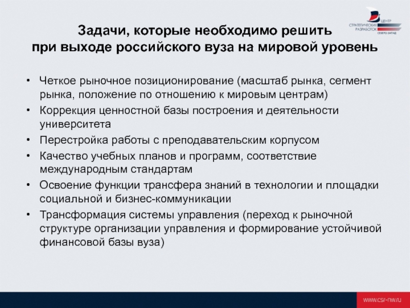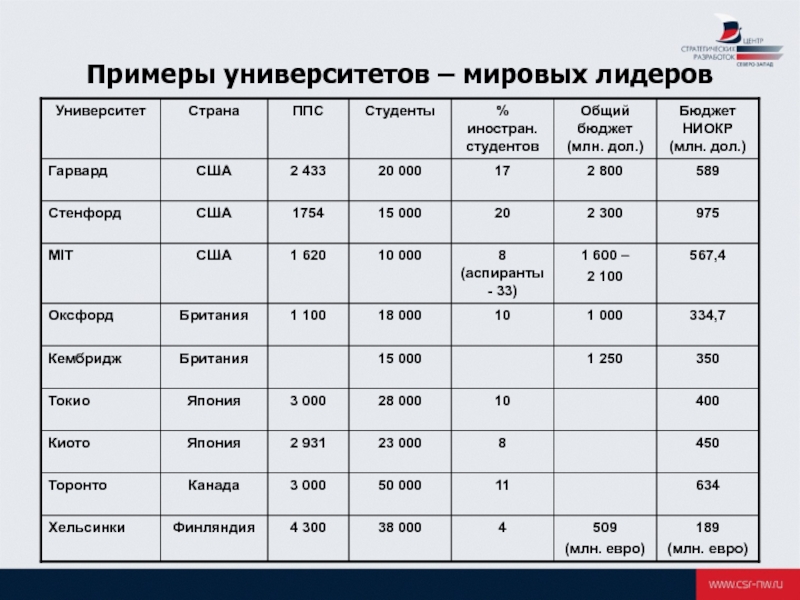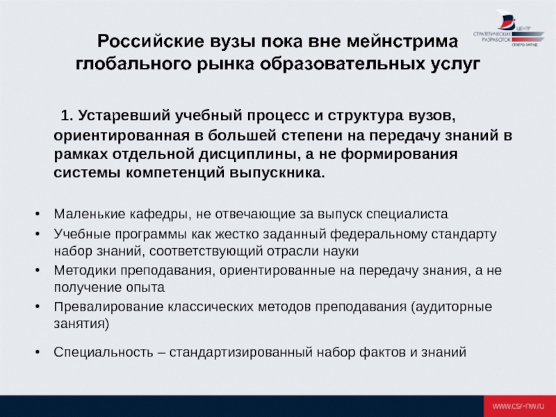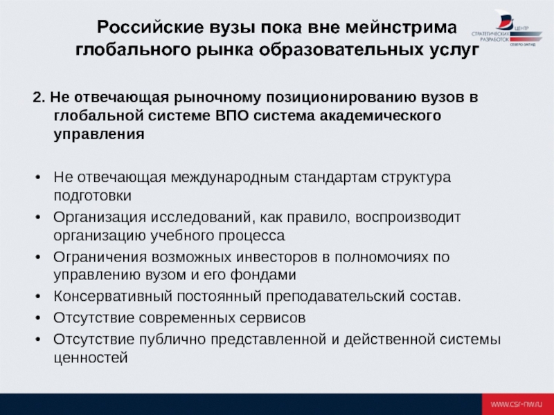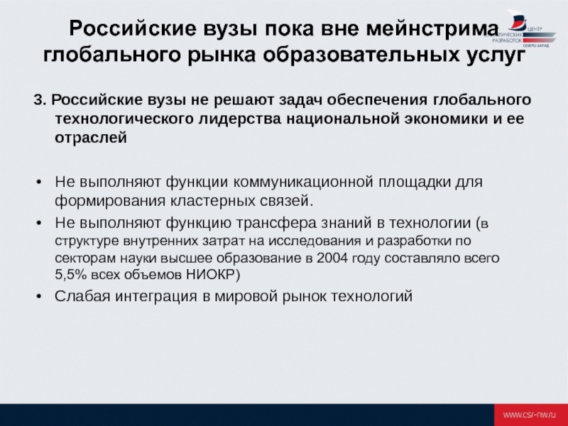 1. Для университетов развитых стран ключевой проблемой становится эффективность образовательной и инновационно-технологической деятельности. Им угрожает «синдром GM» - неконкурентоспособность вследствие больших расходов и гипертрофированной коммерциализации.