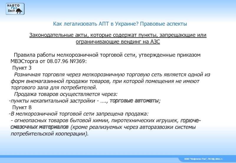 Законодательные акты, которые содержат пункты, запрещающие или ограничивающие вендинг на АЗС