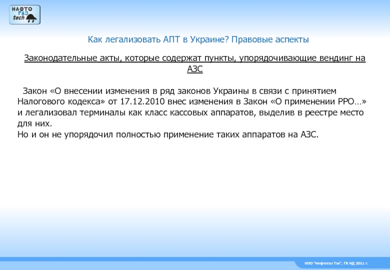 Закон «О внесении изменения в ряд законов Украины в связи с принятием Налогового кодекса» от 17.12.2010 внес изменения в Закон «О применении РРО…» и легализовал терминалы как класс кассовых аппаратов, выделив в реестре место для них.