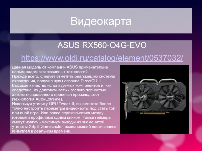 Используя утилиту GPU Tweak II, вы сможете более точно настроить параметры видеокарты под стать той или иной игре. Или вовсе переключаться между готовыми профилями одним кликом. Также геймеры смогут извлечь максимум выгоды из знаменитой утилиты XSplit Gamecaster, позволяющей вести запись геймплея в реальном времени.