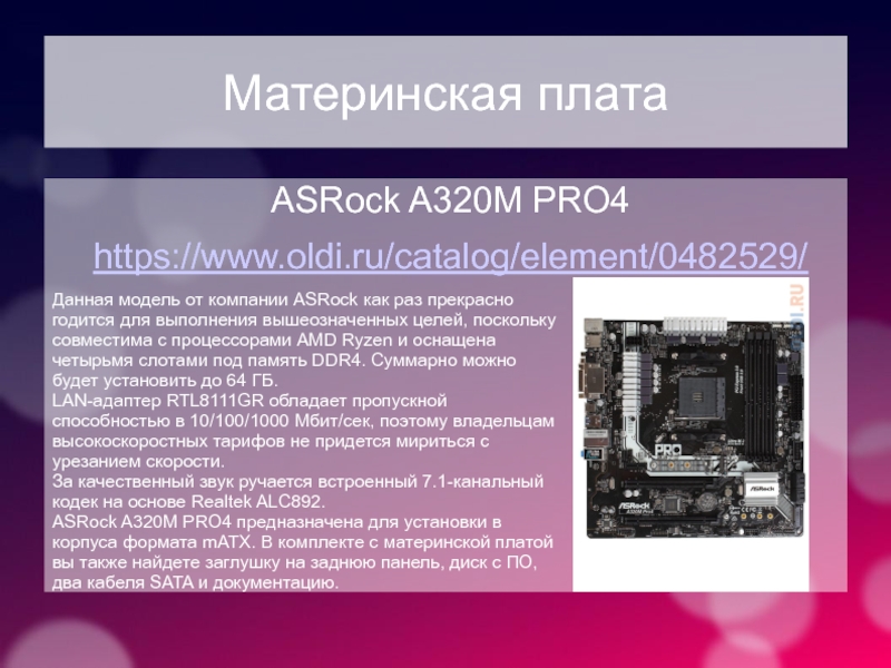 ASRock A320M PRO4 предназначена для установки в корпуса формата mATX. В комплекте с материнской платой вы также найдете заглушку на заднюю панель, диск с ПО, два кабеля SATA и документацию.