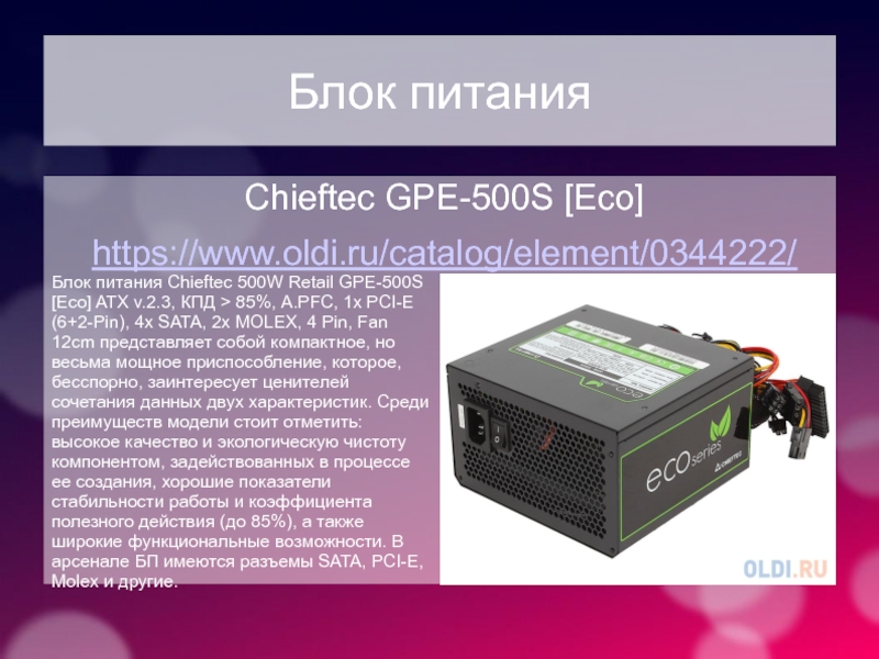 v.2.3, КПД > 85%, A.PFC, 1x PCI-E (6+2-Pin), 4x SATA, 2x MOLEX, 4 Pin, Fan 12cm представляет собой компактное, но весьма мощное приспособление, которое, бесспорно, заинтересует ценителей сочетания данных двух характеристик. Среди преимуществ модели стоит отметить: высокое качество и экологическую чистоту компонентом, задействованных в процессе ее создания, хорошие показатели стабильности работы и коэффициента полезного действия (до 85%), а также широкие функциональные возможности. В арсенале БП имеются разъемы SATA, PCI-E, Molex и другие.