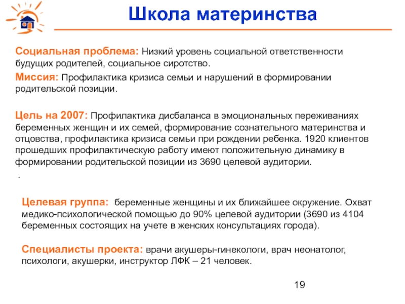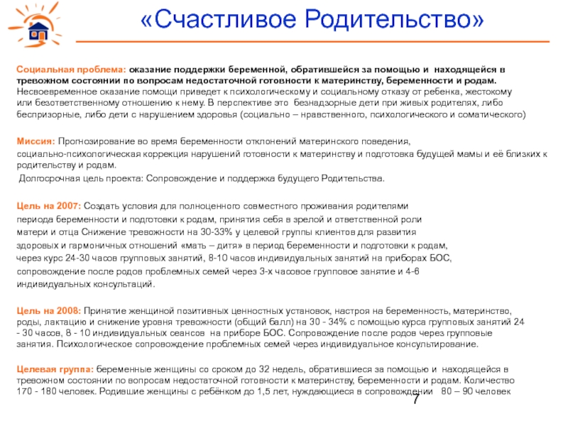 Цель на 2007: Профилактика дисбаланса в эмоциональных переживаниях беременных женщин и их семей, формирование сознательного материнства и отцовства, профилактика кризиса семьи при рождении ребенка. 1920 клиентов прошедших профилактическую работу имеют положительную динамику в формировании родительской позиции из 3690 целевой аудитории.