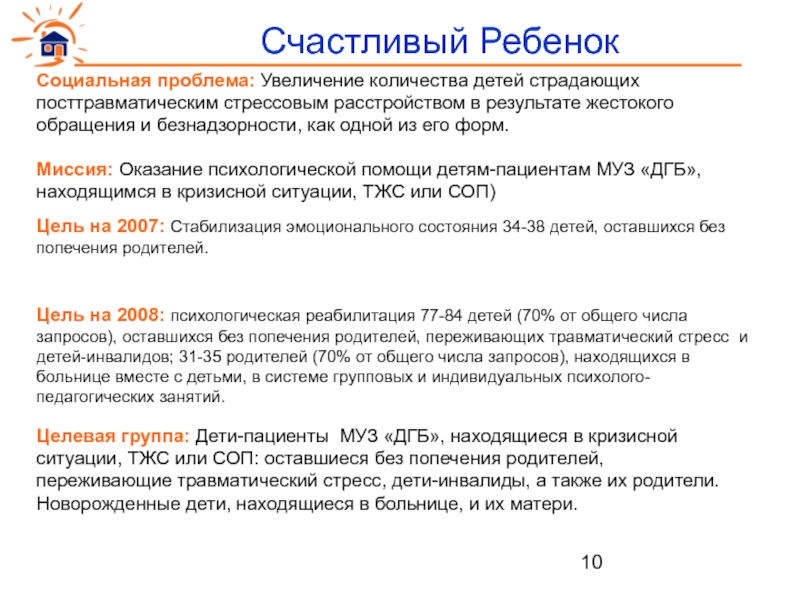Целевая группа: Дети-пациенты МУЗ «ДГБ», находящиеся в кризисной ситуации, ТЖС или СОП: оставшиеся без попечения родителей, переживающие травматический стресс, дети-инвалиды, а также их родители. Новорожденные дети, находящиеся в больнице, и их матери.