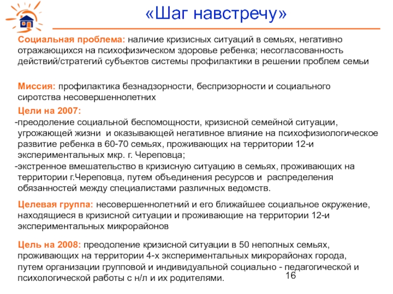 Цель на 2008: преодоление кризисной ситуации в 50 неполных семьях, проживающих на территории 4-х экспериментальных микрорайонах города, путем организации групповой и индивидуальной социально - педагогической и психологической работы с н/л и их родителями.