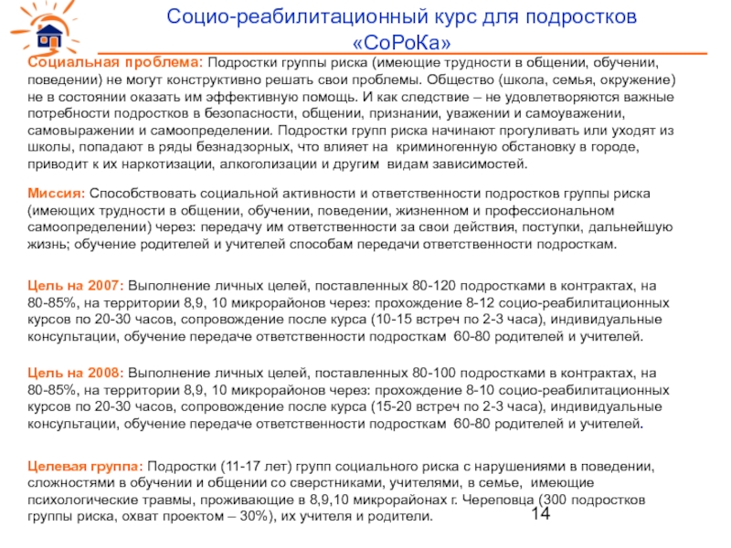 Целевая группа: несовершеннолетние в ТЖС и СОП и их семьи (около 4,3% от общего числа несовершеннолетних, проживающих в Череповце в 8,9,10 мкр. по данным 2006г.)