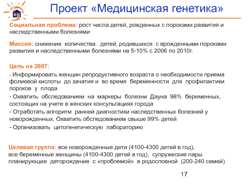 Миссия: снижение количества  детей, родившихся с врожденными пороками развития и наследственными болезнями на 5-10% с 2006 по 2010г.