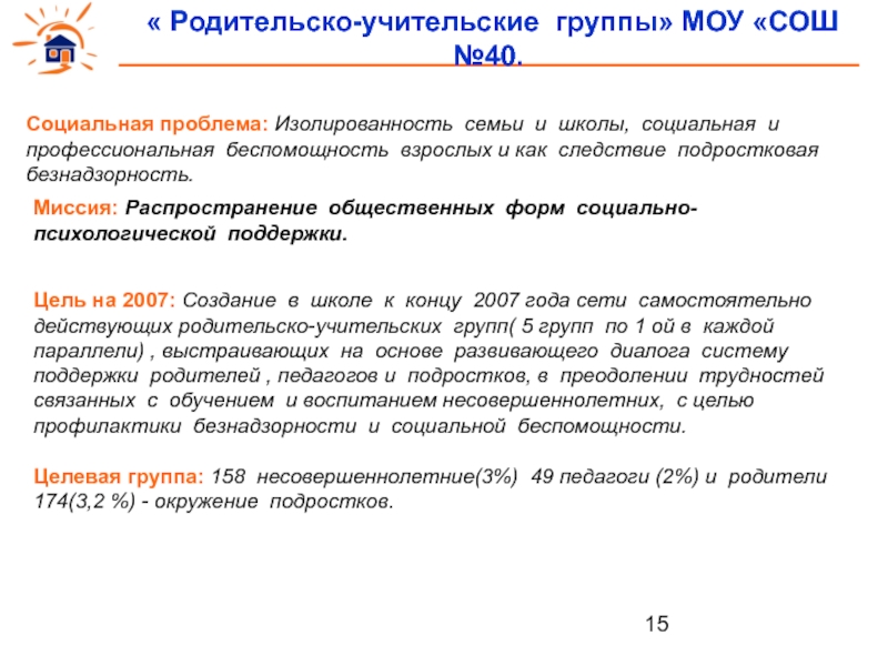 Цель на 2007: Создание в школе к концу 2007 года сети самостоятельно действующих родительско-учительских групп( 5 групп по 1 ой в каждой параллели) , выстраивающих на основе развивающего диалога систему поддержки родителей , педагогов и подростков, в преодолении трудностей связанных с обучением и воспитанием несовершеннолетних, с целью профилактики безнадзорности и социальной беспомощности.