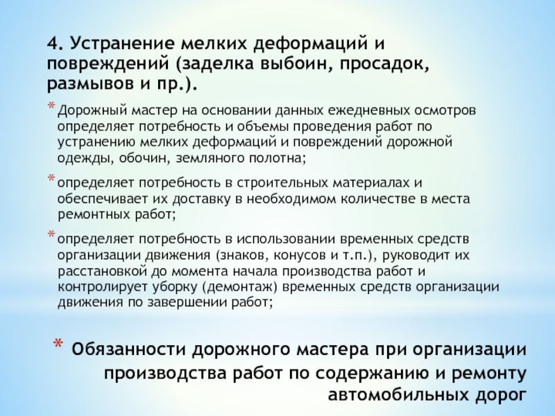 Дорожный мастер на основании данных ежедневных осмотров определяет потребность и объемы проведения работ по устранению мелких деформаций и повреждений дорожной одежды, обочин, земляного полотна;