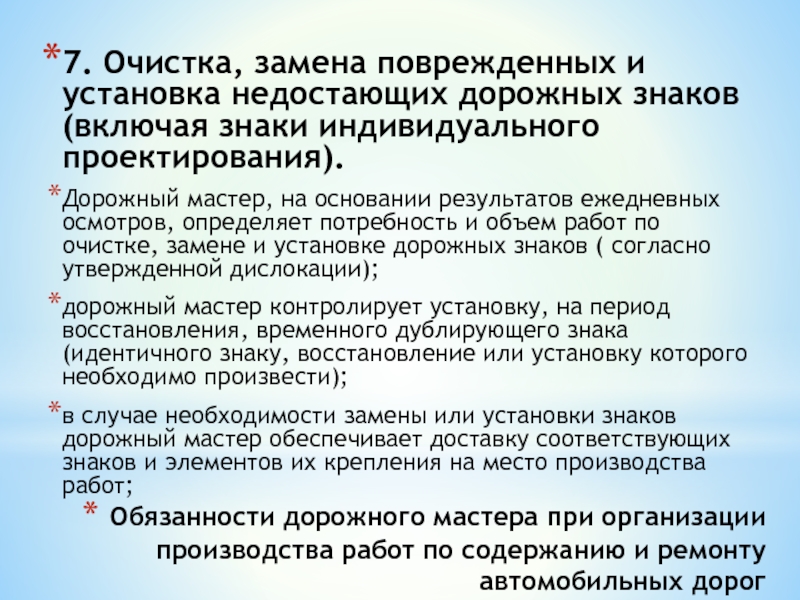 7. Очистка, замена поврежденных и установка недостающих дорожных знаков (включая знаки индивидуального проектирования).