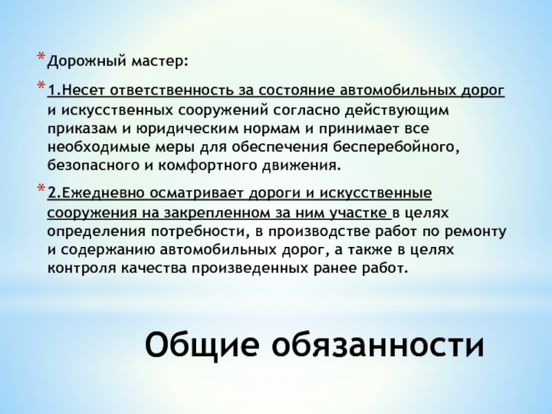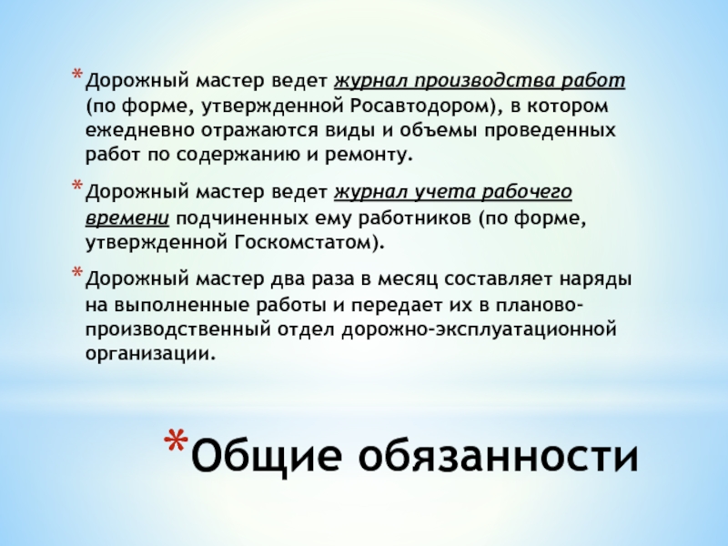 - Дорожный мастер на основании ежедневных осмотров с персоналом, обслуживающим пункты по учету движения, пункты весового контроля, дорожные метеорологические пункты и станции, снегомерные и водомерные посты, составляет и передает в письменном виде главному инженеру дорожно-эксплуатационной организации перечень дефектов, которые могут быть исправлены только специалистами по ремонту и эксплуатации используемого на указанных объектах оборудования.