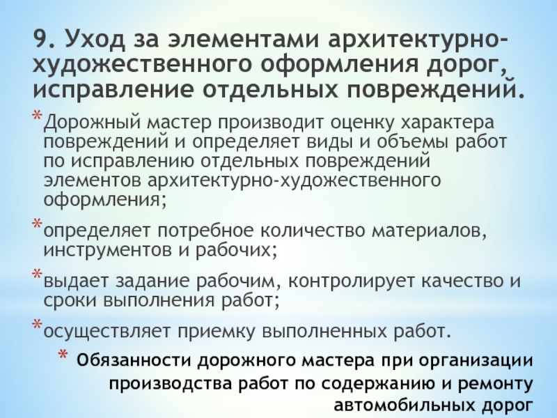 9. Уход за элементами архитектурно-художественного оформления дорог, исправление отдельных повреждений.