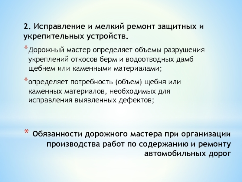 2. Исправление и мелкий ремонт защитных и укрепительных устройств.