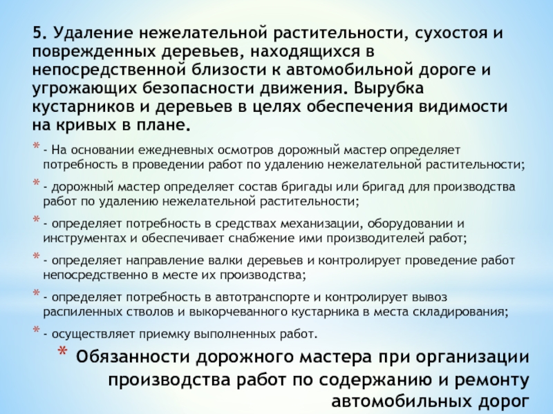 - дорожный мастер определяет состав бригады или бригад для производства работ по удалению нежелательной растительности;