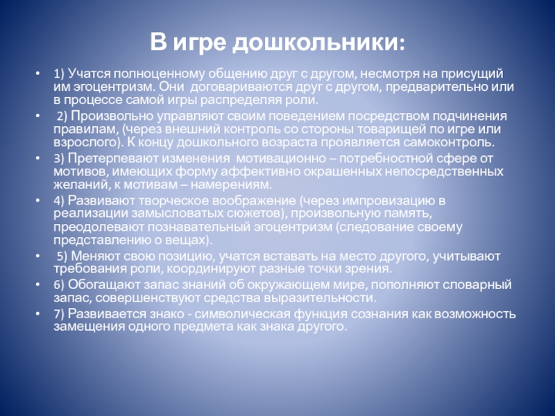 на присущий им эгоцентризм. Они договариваются друг с другом, предварительно или в процессе самой игры распределяя роли.