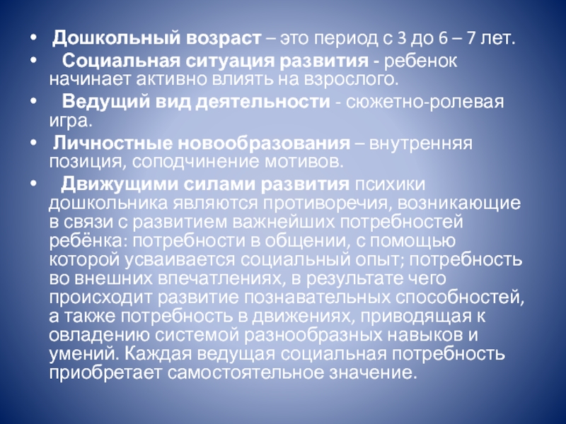 Движущими силами развития психики дошкольника являются противоречия, возникающие в связи с развитием важнейших потребностей ребёнка: потребности в общении, с помощью которой усваивается социальный опыт; потребность во внешних впечатлениях, в результате чего происходит развитие познавательных способностей, а также потребность в движениях, приводящая к овладению системой разнообразных навыков и умений. Каждая ведущая социальная потребность приобретает самостоятельное значение.